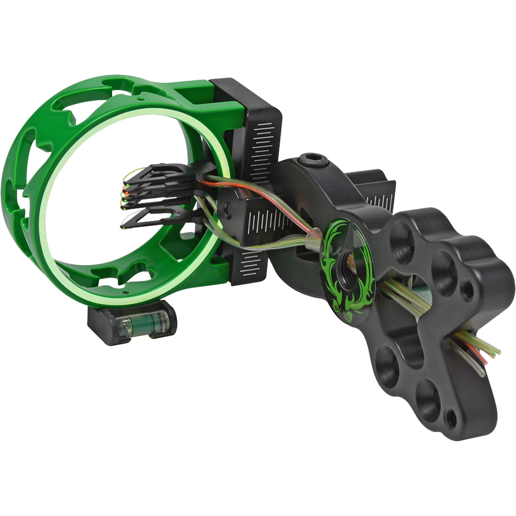 The Aluma 5-Pin Sight features all-aluminum construction, green head for quick sight acquisition, and 4 fiber optic pins with an additional drop pin. This sight can be used right or left-handed and includes a level and sight light.