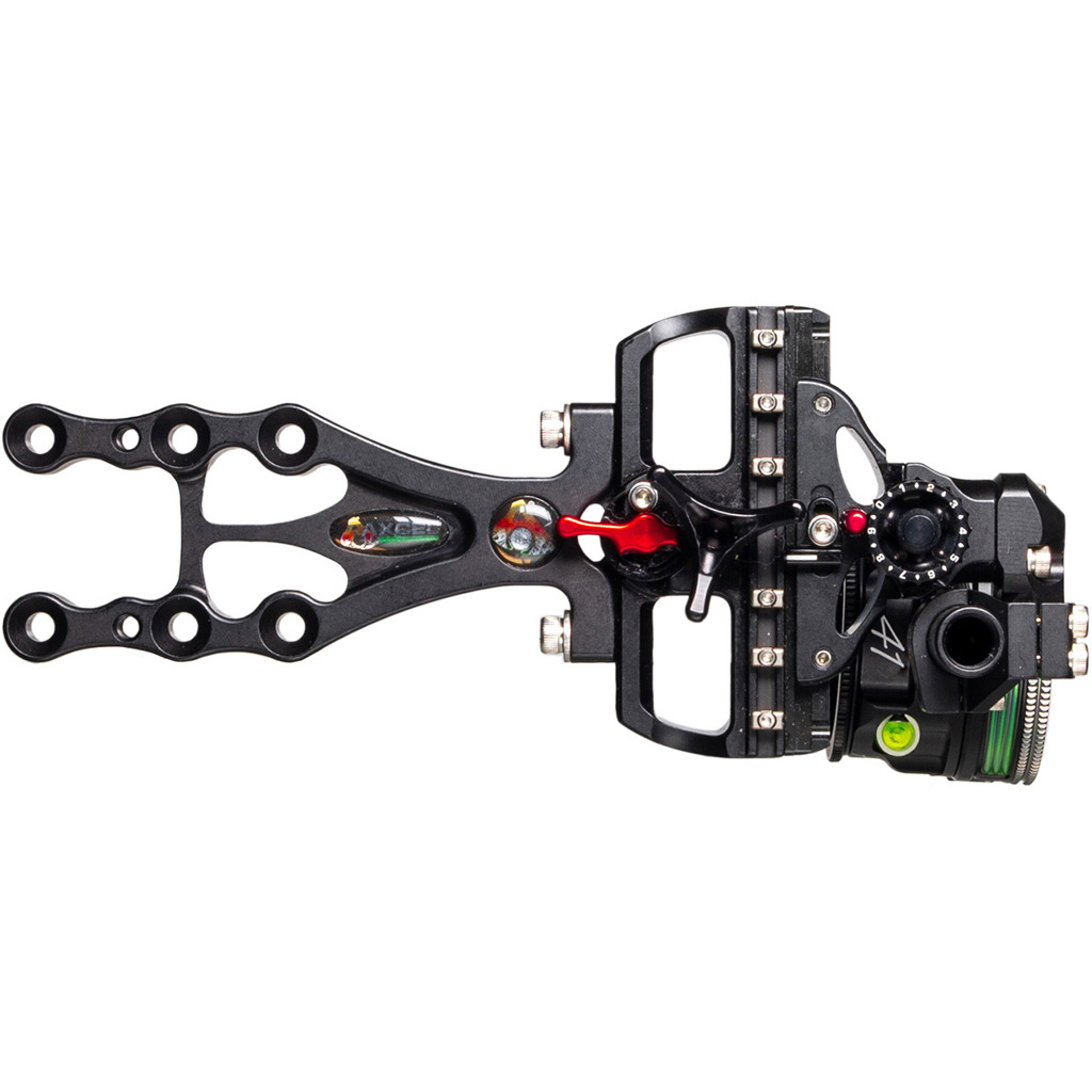 Single pin adjustable sight features Accu-Click system which allows the shooter to set “clicks” at desired distances. As the sight elevation is adjusted, it will stop at those specified distances. A 45 degree facing sight tape makes it easier for the shooter to see where the yardage indicator is set. 1st, 2nd, and 3rd axis adjustments can be made without the use of shims. Micro adjust windage is locked into place until the Windage Lock Button is disengaged. Includes Axcel AccuView Scope with Fire Pin, Crosshair Insert, and adjustable rheostat. Available in 31mm or 41mm scope diameters.