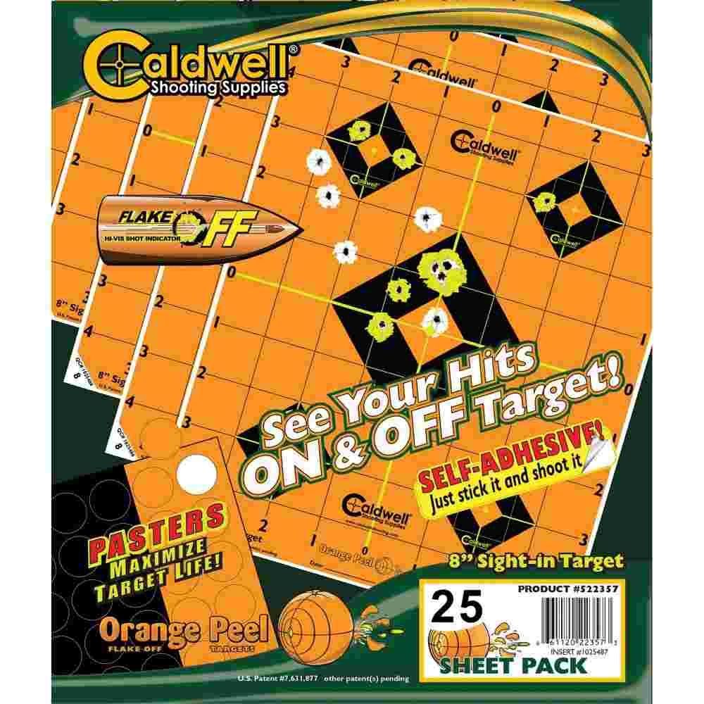 Get on target with Caldwell 8in Sight-In Target 25 Sheets Orange Peel! Orange Peels let you see hits on the target with dual color flake off technology that makes your hits look like colorful explosions. If your shot happens to miss the bullseye you will know exactly where your bullet strayed…instantly. The high contrast orange background and black target make acquisition through the scope easy even at long distances. No need for staples or push pins these targets feature an adhesive back that sticks to almost any surface. Pasters are included in each pack to repair the targets for even more use.