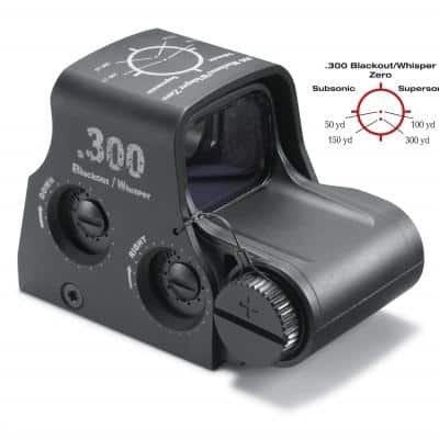 This EOTech 300 Blackout Holographic Weapon Sight offers a 2-dot ballistic drop reticle that allows the shooter to zero either subsonic or supersonic rounds in the same reticle pattern.