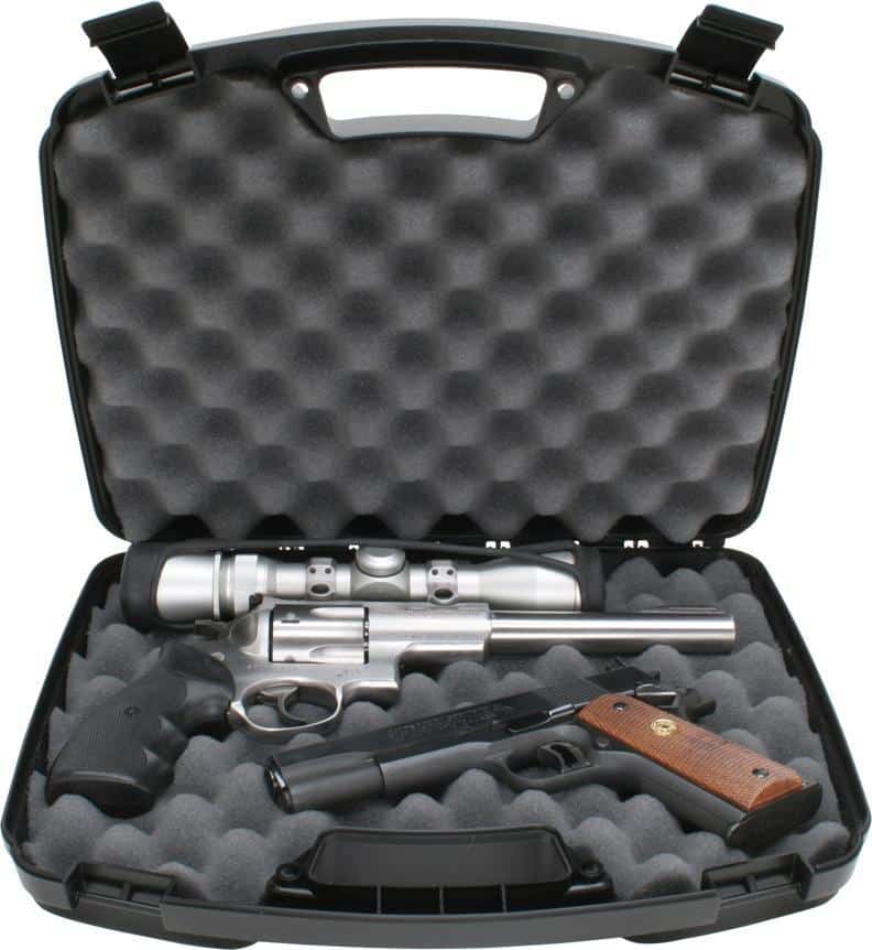 MTM’s Snap Latch Handgun Cases offer durable construction reliable snapping latches and a large comfortable handle. Each is made of rugged polypropylene with a handsome textured finish. Thick foam padding and double padlock tabs are provided for the utmost in protective security. 809 Holds two handguns with barrel lengths up to 8” long. Firearms are securely held in place with two pieces of high-quality convoluted foam padding.
