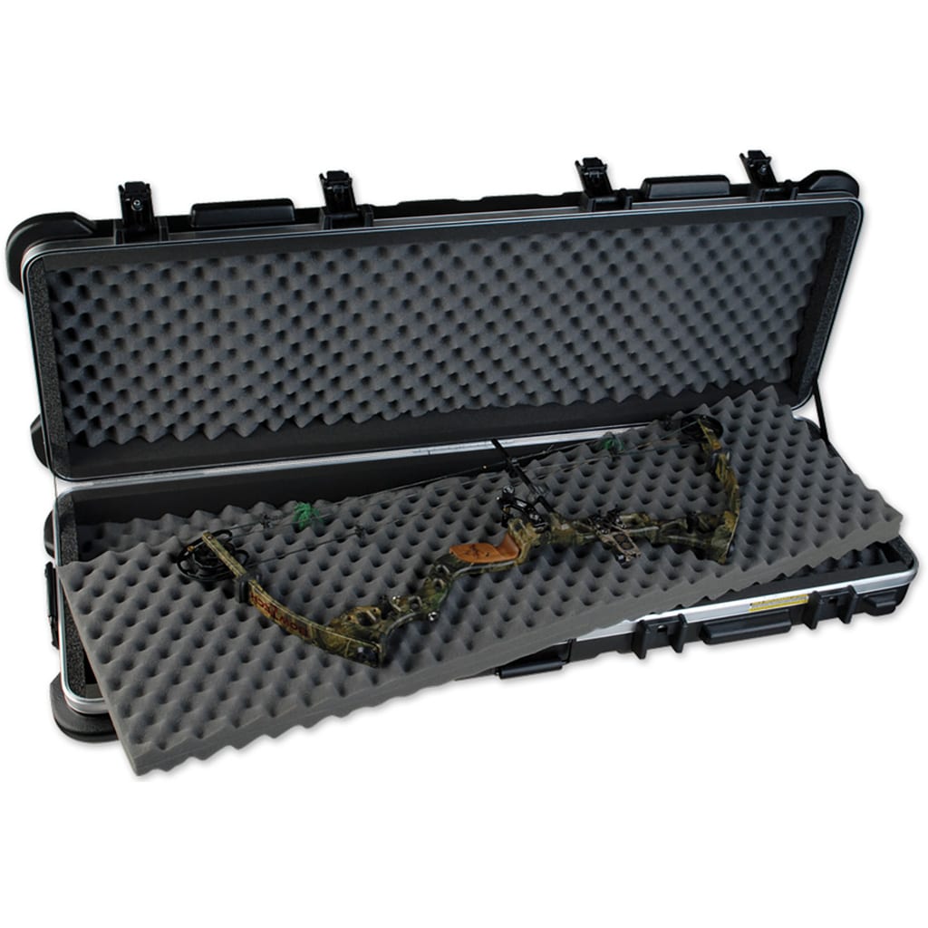 The SKB ATA Parallel Limb Double Bow Case features heavy duty field replaceable locking latches, spring-loaded end handle for comfortable towing and protection from damage, molded in bumper protection to maximize impact resistance and quiet glide heavy duty wheels for easy transport, secure “tie-down” loops for ATV transport are an added feature and stylish embossing that actually adds structural support to the lid. 50″ x 15.5″ x 6″.
